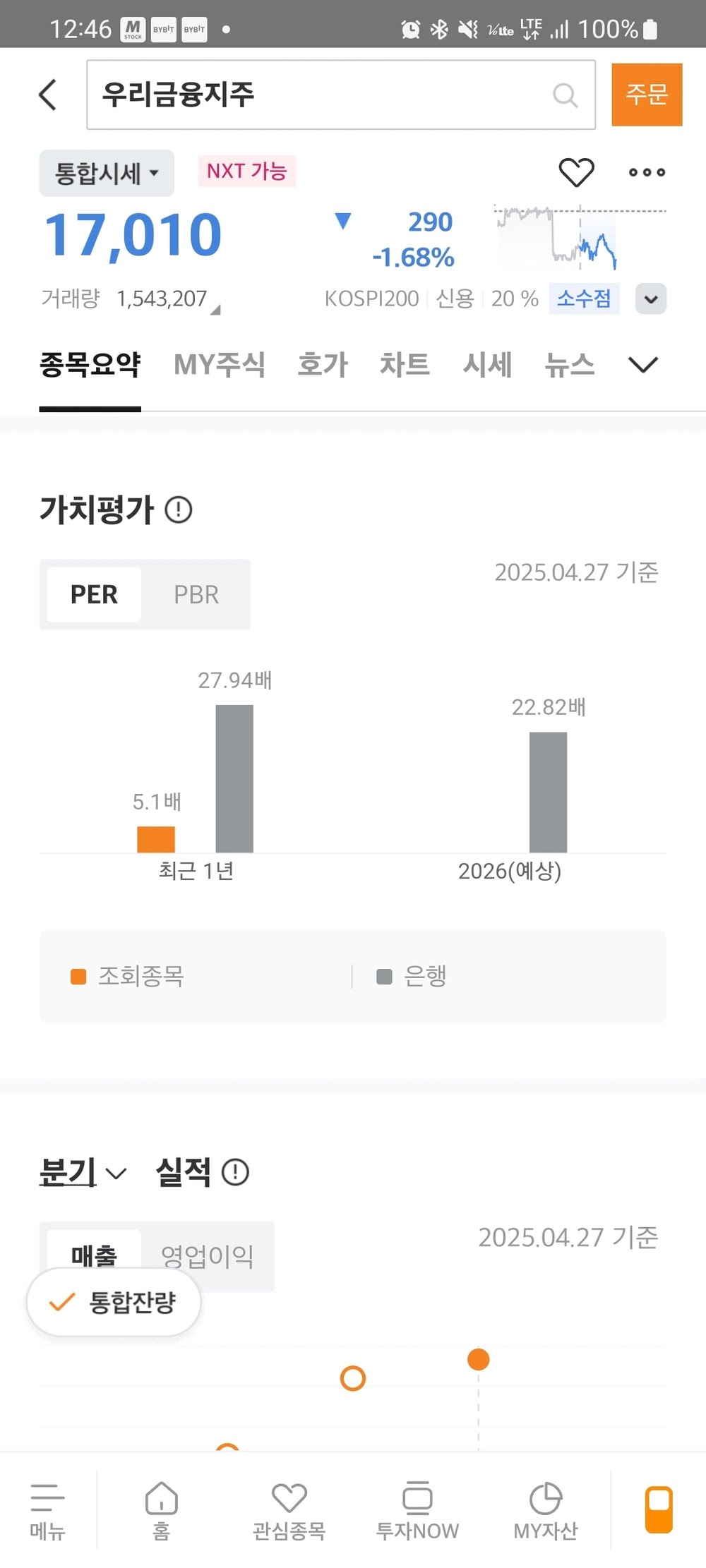 증권사 앱을 실행하고 종목을 검색한 후에 해당 종목을 요약 정보를 확인하면 PER 정보를 확인할 수 있습니다.